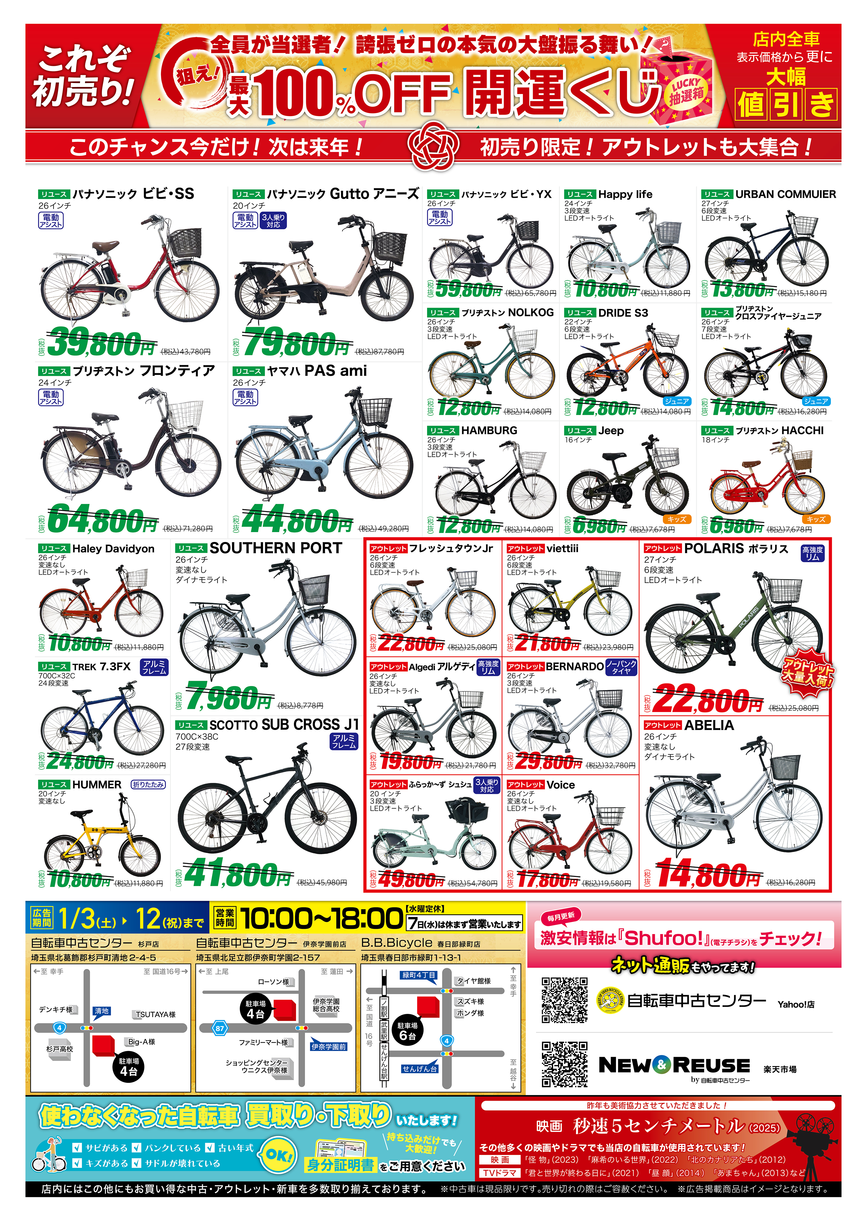 自転車中古センター杉戸店、伊奈学園前店、B.B.Bicycle春日部緑町店・・・10時オープン